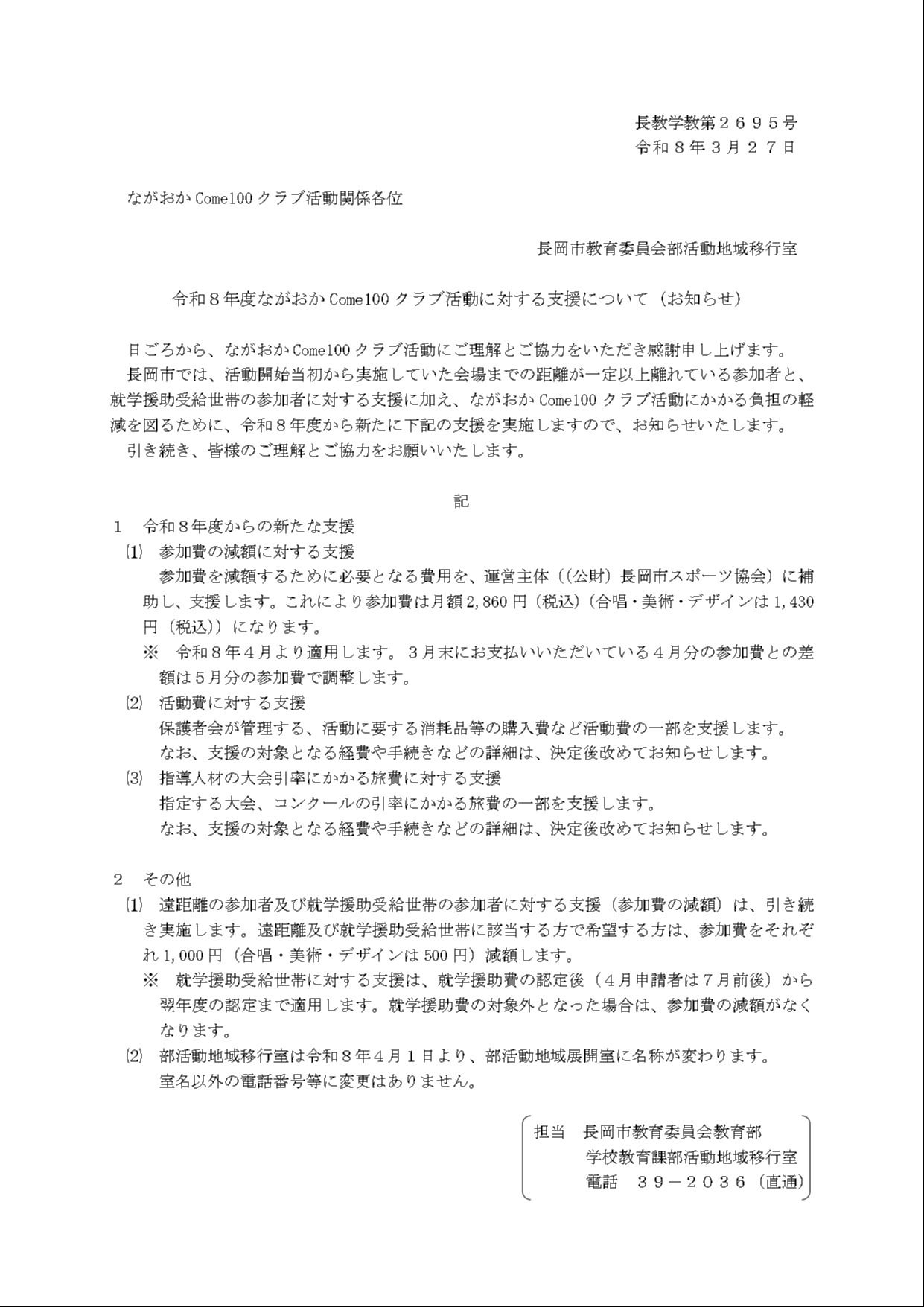 重要【重要】令和8年度ながおかCome100クラブ活動に対する支援について