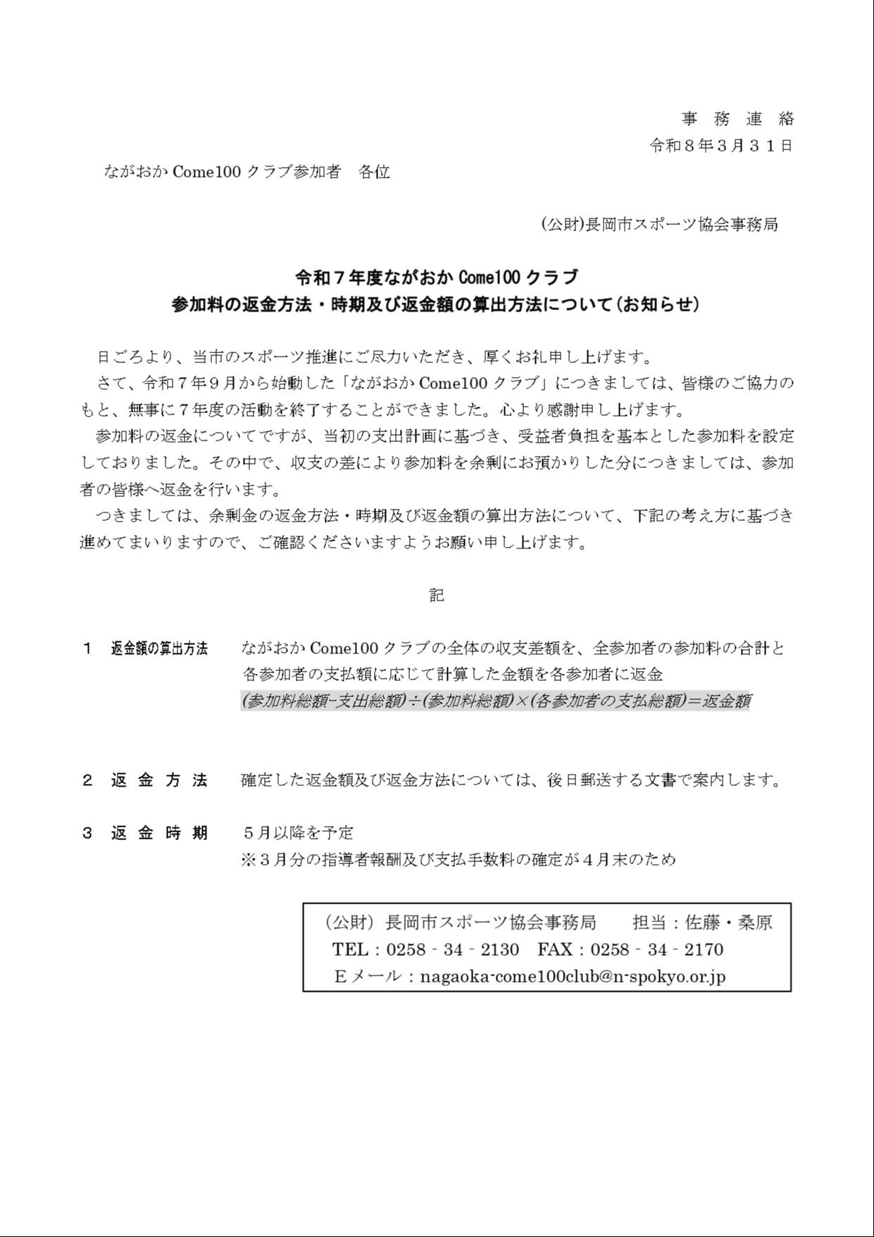 ながおかCome100クラブの全体の収支差額を、全参加者の参加料の合計と各参加者の支払額に応じて計算した金額を各参加者に返金 (参加料総額ー支出総額)÷(参加料総額)×(各参加者の支払総額)=返金額